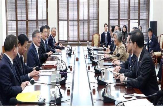 문 대통령은 이날 회의에서 “남북 정상회담이 판문점에서, 그것도 군사분계선 남쪽 우리 땅에서 열리는 것은 사상 최초”라며 “남북 정상회담에 이어서 북미 정상회담은 회담 자체가 세계사적인 일”이라고 평가했다.