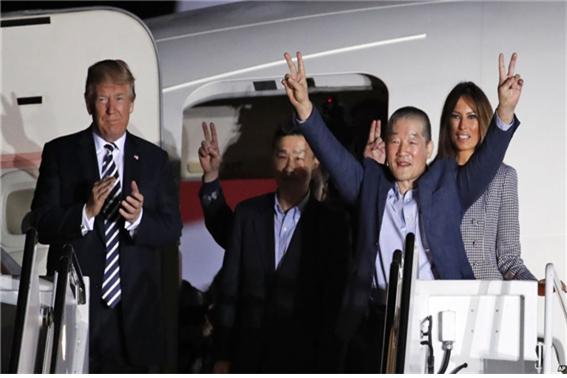 워싱턴 인근 앤드루스 공군기지에서 이들을 직접 맞이한 트럼프 대통령은 “김정은 국무위원장이 억류자들을 조기에 석방한 건 위대한 일이자, 큰 일이었다”며 사의를 표했다.