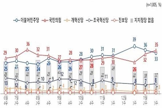 국민의힘 정당 지지도가 35%, 더불어민주당 정당 지지도가 33%라는 여론조사 결과가 나왔다.