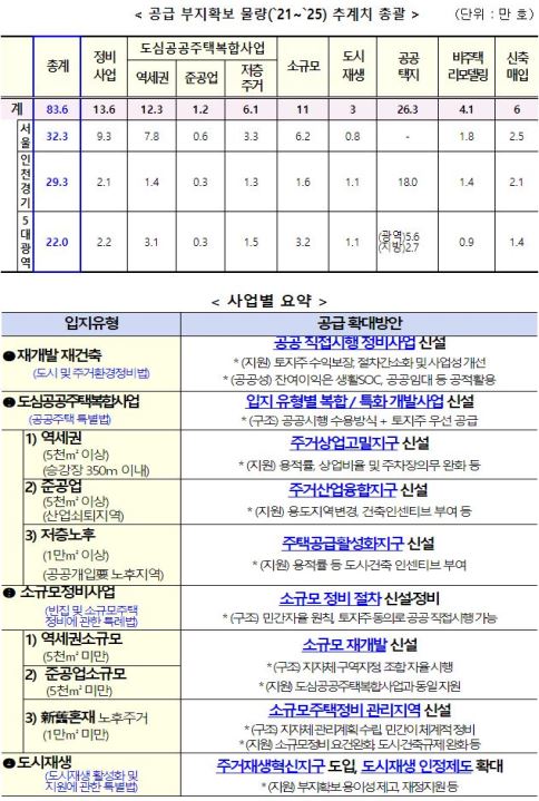 이번 83만6000가구 중 57만3000가구는 도심내 신규 사업을 통해서 공급하고, 26만3000가구는 신규 공공택지 지정 등을 통해 확보한다는 계획이다.